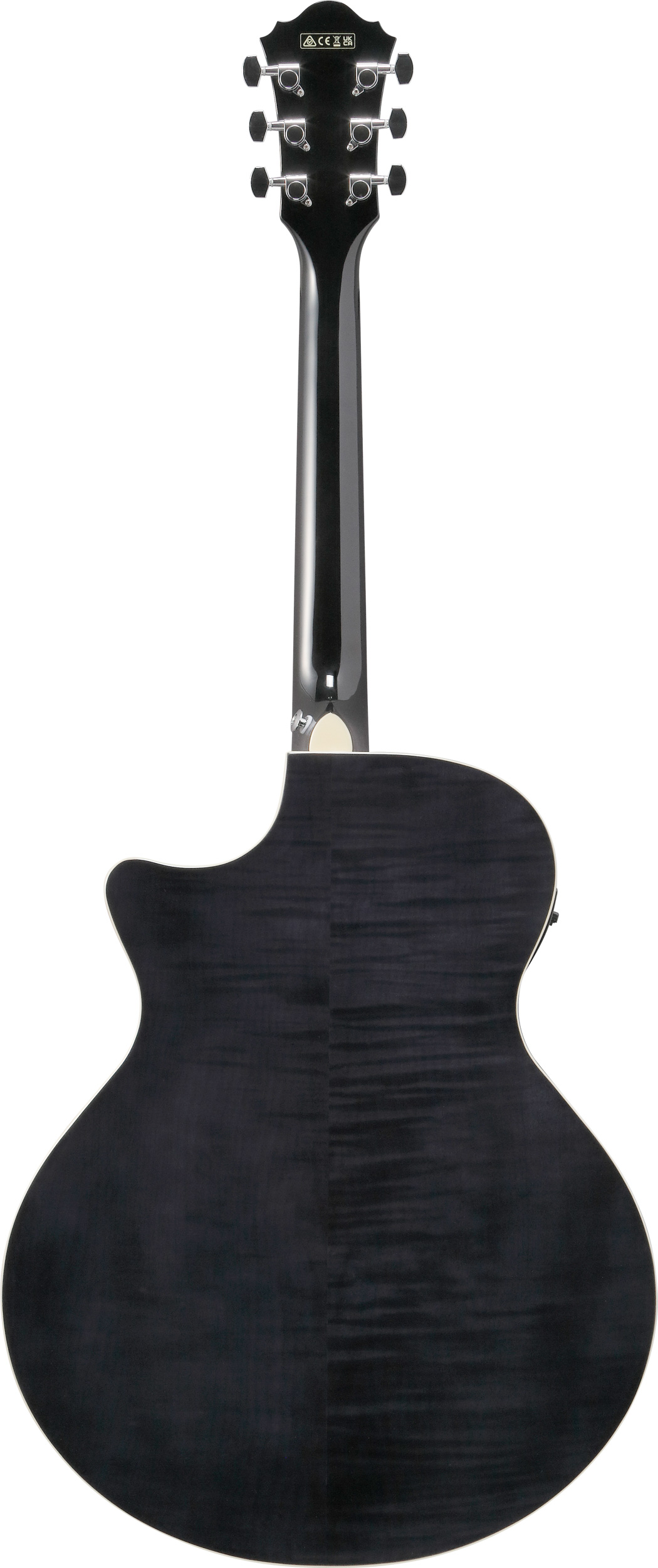 AE170 har ett lock av solid Sitka gran med kropp och sidor av flammig lönn, lackerad i transparent svart.