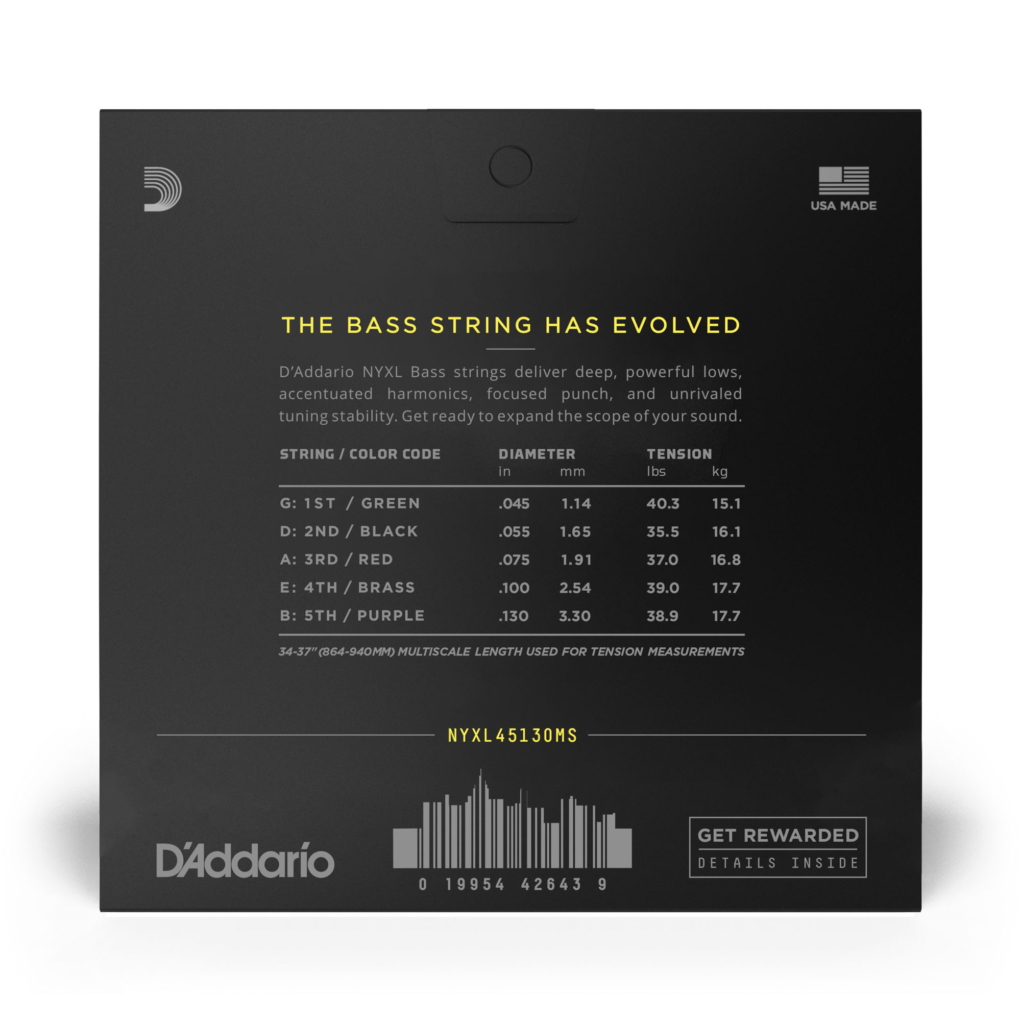 NYXL Bass kombinerar D'Addarios stålkolkärna, NY STEEL, med en omgjord nickelpläterad stålspinning. Denna konstruktion ger en djup och kraftfull baston med ett fokuserat, tajt och punchigt mellanregister och ett komplext övertonsregister. Designad för alla spelstilar har NYXL Bass ett större dynamiskt omfång och en längre sustain än någon annan bassträng.