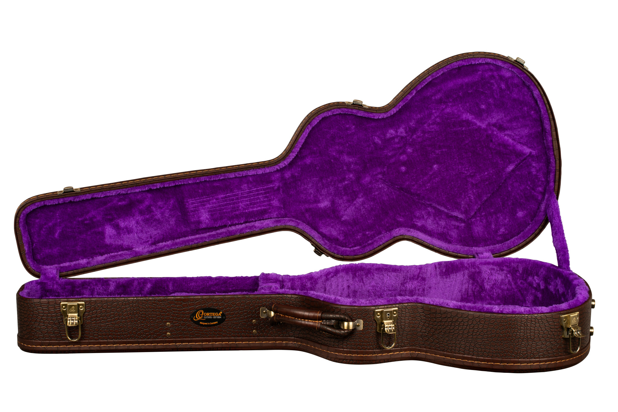Ekstraordinært deluxe instrumentetui i moderne brun krokodillelignende vinylfinish. Den buede toppen, 15 mm polstring dekket med attraktiv fiolett fløyel, innebygd hygrometer, romslig tilbehørsrom, kombinasjonslås, bronsebeslag i vintage-stil og et komfortabelt mykt dobbeltrørshåndtak gjør disse koffertene både elegante og praktiske.