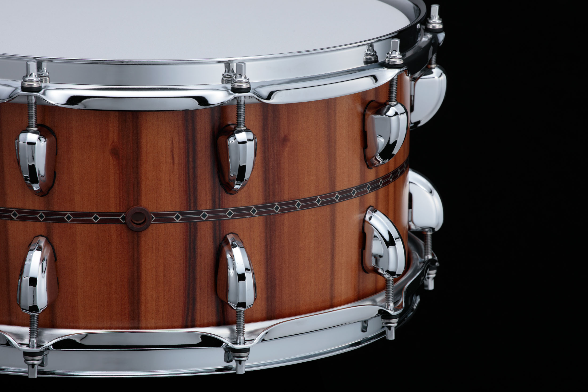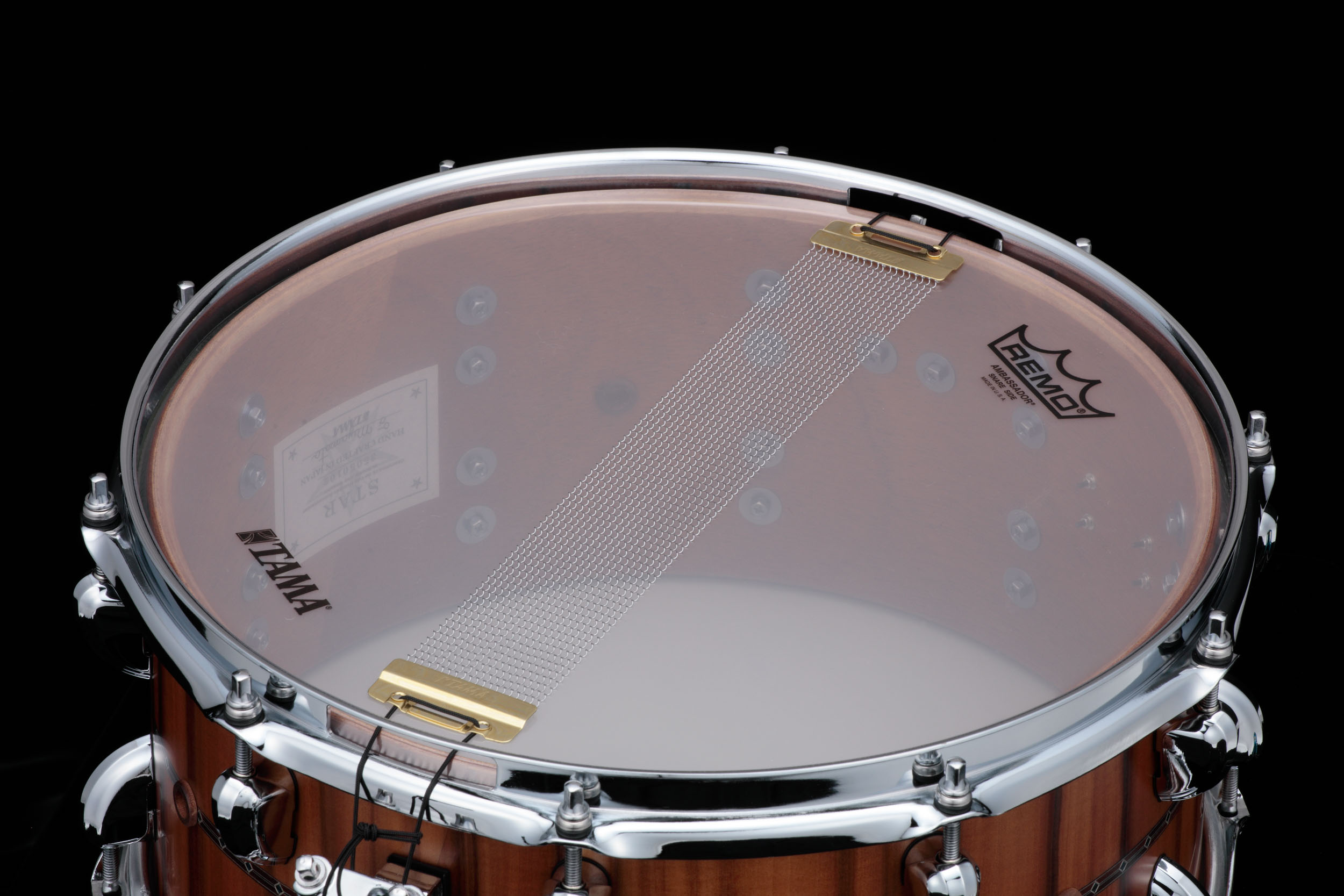 Denne STAR Reserve er en begrenset modell med en ekstra tykk mahognikropp av 9 mm 11-lags G-mahogni. Dette gir en varm, fyldig tone med et forbedret dypt register, og med Super Sensitive sidematte gir den en klar og relativt tørr seidelyd, perfekt for delikate ghost hits. For å bevare den åpne og resonante lyden av mahogni, brukes 2,3 mm Mighty Hoops, pressede strammeringer. Skarptrommen skiller seg visuelt ut med sin raffinerte estetikk som har en ytre kryssfiner av Tineo, et treslag kjent for sin naturlige rødbrune tone og frodige vertikale åring.