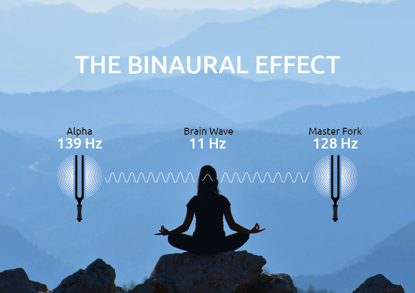 För att skapa den binaurala effekten, aktivera Binaural Therapy Tuning Fork och Master Fork 128 Hz och håll dem mot höger och vänster öra. Hjärnan kommer att känna igen skillnaden mellan de två frekvenserna och uppfatta en tredje frekvens som leder dig in i önskat tillstånd av hjärnvåg.