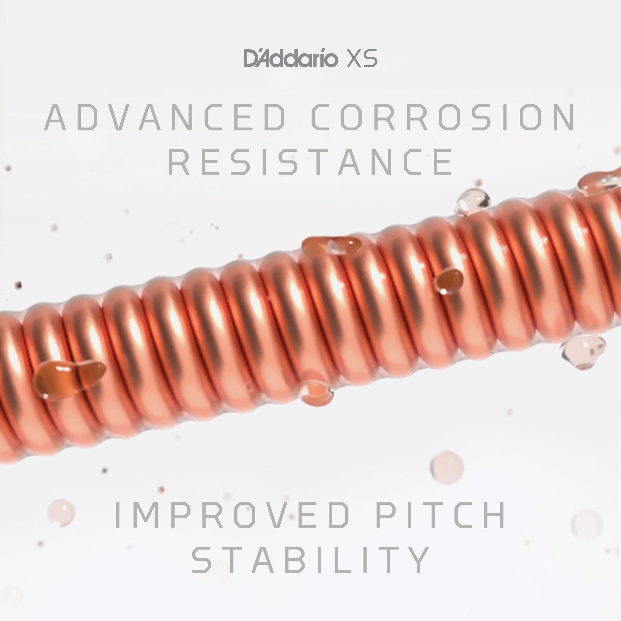 Varje enskild sträng i ett set XS är behandlad med D'Addarios skyddande mikrocoating, en supertunn ytbehandling som effektivt stöter bort smuts och svett. XS-strängarna varar 4ggr längre än traditionella o-coatade strängar utan att påverka den ton och spelkänsla som D'Addarios strängar blivit erkända för. D'Addarios unika stålkolkärna i kombination med en stark förankring av kulan, genom sk Fusion Twist technology, ger en sträng med oöverträffad styrka och som håller stämningen avsevärt bättre än vanliga strängar.